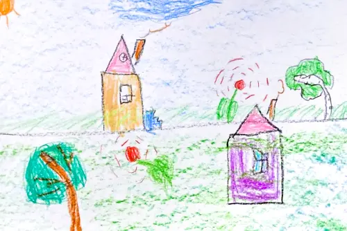На рисунке изображено два разных дома, желтый и фиолетовый, на крышах трубы, из которых идет дым. Вокруг домов растут цветы, деревья. На небе светит солнышко и плывет облако.