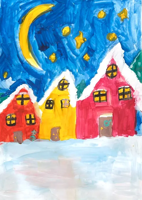 Я нарисовал красивый город с высокими домами и ещё много снега, это перед новым годом. В моём городе есть широкие улицы, яркие фонари и много-много ярких украшений зимой.