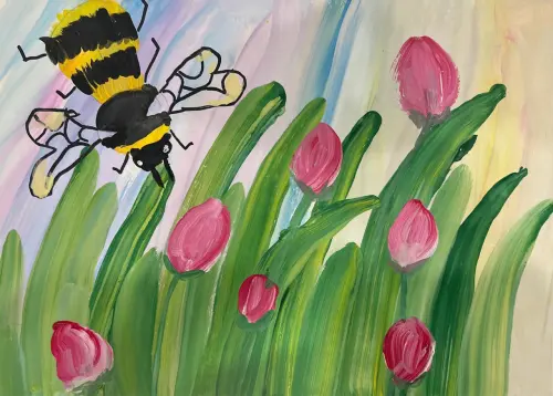 Я хочу рассказать про свою картину, которую нарисовала этим летом. На ней изображена пчелка на московской клумбе — так красиво получилось!