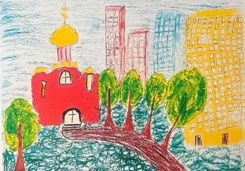 В моём районе находится красивая церковь. Дорога к церкви проходит через парк. В парке очень красиво, деревья и свежий воздух. Мне очень нравиться гулять по парку.