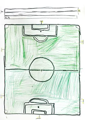 Я люблю футбол и геометрию. Поэтому решил совместить эти мои хобби в одном рисунке. Также это прекрасная возможность показать футбольное поле в том дворе, в котором я живу в своем любимом районе Куркино, который расположен на Северо-западе Москвы.