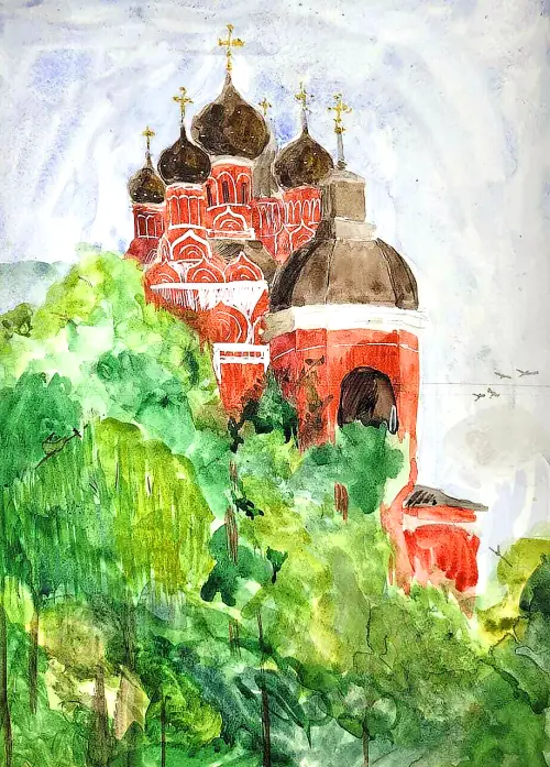 На рисунке изображён Храм Тихвинской иконы Божией Матери в Алексеевском районе, поражающий своей удивительной архитектурой и историей. Представляет собой пятиглавый храм в стиле «русское узорочье» на высоком подклете, способный вместить до трёх тысяч человек. Главный четырёхугольный объём украшен тремя рядами кокошников, на которых возвышаются пять глав с куполами. Принадлежит Троицкому благочинию Московской епархии.