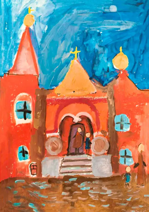 На рисунке изображен приют братьев Бахрушиных в Алексеевском районе Москвы. Это комплекс зданий, возведённый в 1898–1907 годах на средства промышленников Петра, Александра и Василия Бахрушиных для устройства детского сиротского приюта. Приют принимал на содержание детей с четырёх лет до совершеннолетия и «выхода в люди». Здания выполнены из красного кирпича, пожертвованного Мытищинским заводом, и декорированы наличниками и фигурными карнизами. Центром застройки стал храм Живоначальной Троицы в русском стиле, возведённый Карлом Гиппиусом и освящённый 18 мая 1903 года митрополитом Московским Владимиром.