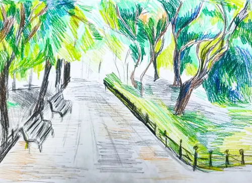 Меня зовут Полина. Я очень люблю свой город, особенно парки и скверы. Они стали очень красивые, ухоженные. Недавно я побывала в Миусском парке и мне захотелось его нарисовать.