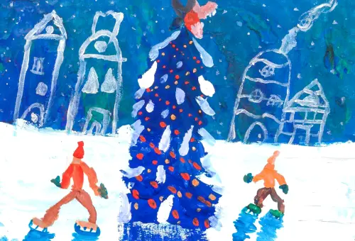 Этот рисунок про мероприятие, посвященное Новому году, которое проходило на катке в соседнем дворе. Всей семьей с радостью приняли участие в мероприятии.