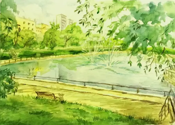 Работа выполнена на бумаге в технике акварель. Юный художник является студийцем АНО «Фантазия», в районе аэропорт города Москвы, преподаватель: Строева Елена Владимировна. Рисунок размером 30Х40. На рисунке изображена любимая жителями района прогулочная зона Амбулаторного пруда с фонтанами. Время появления пруда не установлено. На карте 1838 года на месте современного пруда показано болото, из которого берёт исток речка Ходынка. Образовался в результате запруживания ручья, являющегося истоком реки Таракановки и находящегося сейчас в трубе. Рядом с прудом находился Инвалидный рынок, названный так потому, что недалеко от этого места находилось Александровское убежище (инвалидный дом) для ветеранов русско-турецкой войны. Пруд находится в организованной прогулочной зоне между улицами Усиевича, Асеева, Самеда Вургуна и Часовой.