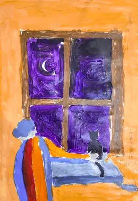 На рисунке изображено уютное окно жилого дома, в котором на подоконнике сидит чёрная кошка — символ местных «старожилов» и наблюдателей за жизнью района. Кошка смотрит наружу, словно внимательно следит за событиями на улице, олицетворяя связь между домом и окружающим миром. Тёмный окрас кошки контрастирует с мягким светом, проникающим через стекло, что придаёт работе загадочность и глубину. Композиция передаёт чувство стабильности и непрерывности, показывая, как даже маленькие обитатели района становятся частью его истории и характера. Цветовая гамма выполнена в тёплых и приглушённых тонах, что усиливает ощущение уюта и спокойствия.