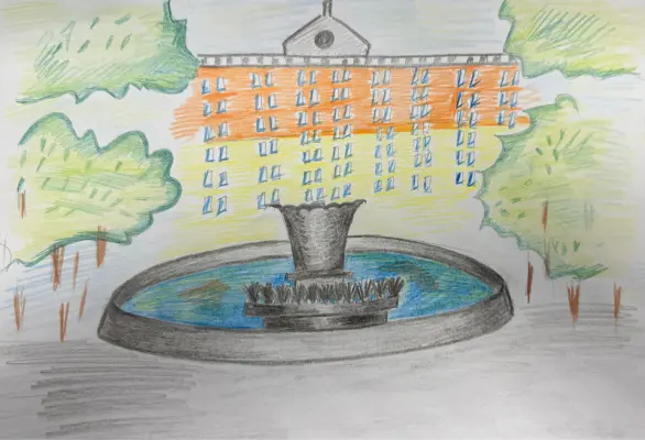 Фонтан, который находится в сквере около дома. Небольшая справка: Фонтан выполнен в стиле советского неоклассицизма: он облицован гранитом серого цвета, а из его центра возвышается крупный чугунный «цветок». Форсунки расположены по кругу постамента, а также внутри чаши – в результате водные струи образуют красивый размашистый рисунок.
