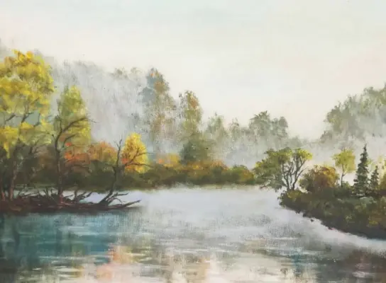 Извилистая речка, зелёные деревья, от воды исходит загадочное сияние, наполняя пейзаж волшебством и жизнью. Работа дышит светом, теплом и чистой детской фантазией.