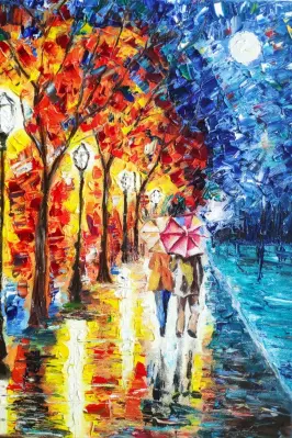 На детском рисунке - уютный дождливый день. Двое под ярким зонтом идут по лужам. Вокруг – разноцветная осенняя листва и весёлые капли дождя. Рисунок вдохновлён осенним периодом в Москве