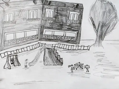 В моём дворе есть детская площадка, там играет много детей, так как рядом находится два больших дома, где проживает много людей. Рядом стоит большой дуб.