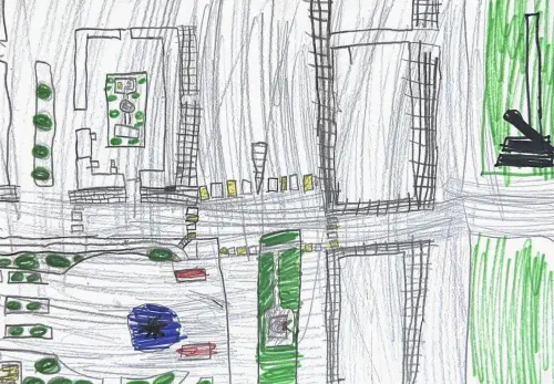 На рисунке я изобразил свой двор и прилегающие территории. Красивую Каштановую аллею и любимый фонтан. В сквере всегда много людей, мне очень нравится там гулять. Возле памятника Фиделю Кастро почти всегда есть живые цветы.