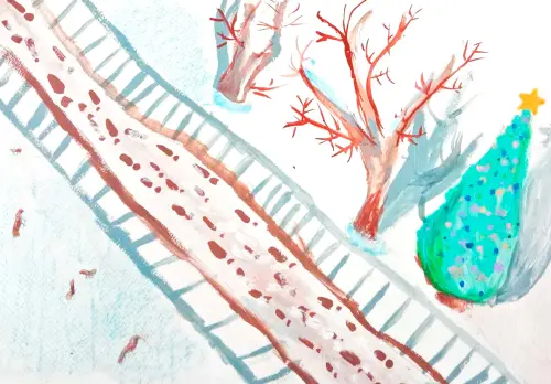 Я нарисовала свой района в зимнее время. Вокруг лежит снег, на деревьях уже нет листьев, зато стоит красивая новогодняя ёлка со звездой на макушке. Очень красиво!