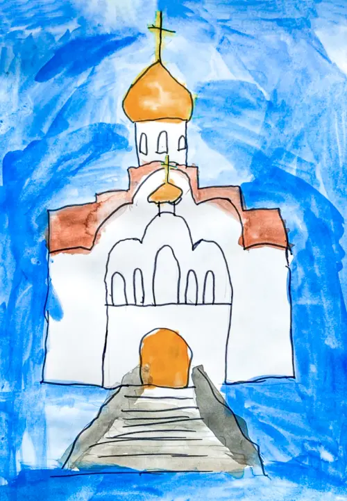 На детском рисунке — яркий, словно пряничный домик, храм с куполами, гордо возвышающийся под чистым голубым небом. Работа дышит наивной радостью, светом и детской мечтой.