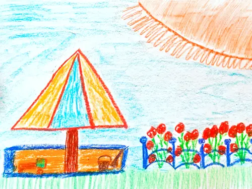 Я нарисовала детскую площадку во дворе. Там есть песочница с грибком, в ней хорошо играться с ведёрком и совочком. А рядом находится клумба с красивыми яркими цветами.