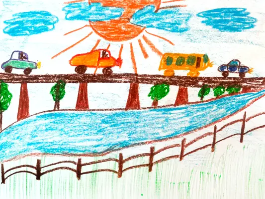 Я нарисовал автомобильный мост в Москве в жаркий летний день. Ярко светит солнце, на улице жара, а люди в машинах едут по дороге по своим делам и любуются из окна видами города.