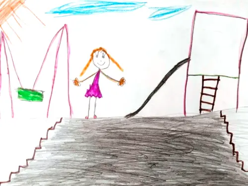 Работа выполнена простым карандашом и цветными карандашами. На рисунке девочка пришла на детскую площадку и ждёт подружек, чтобы поиграть с ними, покататься на качелях и с горки.