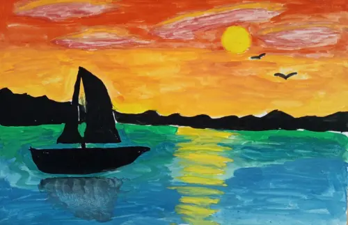 На ярком детском рисунке по синей речке плывёт милый кораблик. Большое круглое солнце, окрашивающее небо в оранжево-красные тона, опускается за горизонт. Вода отражает закат, создавая уютную, тёплую атмосферу. Просто, но полно детской мечтой.