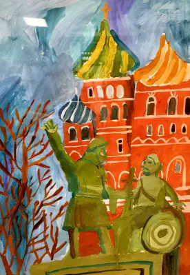 На работе мы видим исторический памятник, посвящённый Дню народного единства, знаменательной дате освобождения Москвы от польских интервентов. Работа формата А2, гуашь.