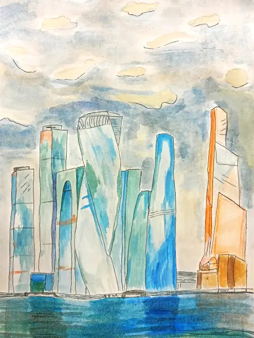 Бумага, акварель, формат А3 Работа изображает вид на архитектурный комплекс Москва-Сити, который всегда завораживает, когда гуляешь по центру Москвы - и ночью и днём!