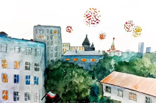 А из нашего окна - площадь Красная видна!! Да и не только. Ещё дома, постройки и много-много окошек, в каждом из которых кипит жизнь, только меняются сезоны. Акварель.