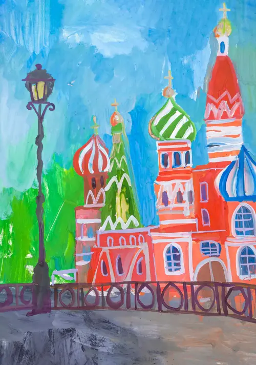 Храм Василия Блаженного-самый нарядный собор Москвы. Расположен храм на Красной площади. Он восхищает и внешней красотой и внутренним убранством. Работа формата А2, техника гуашь.