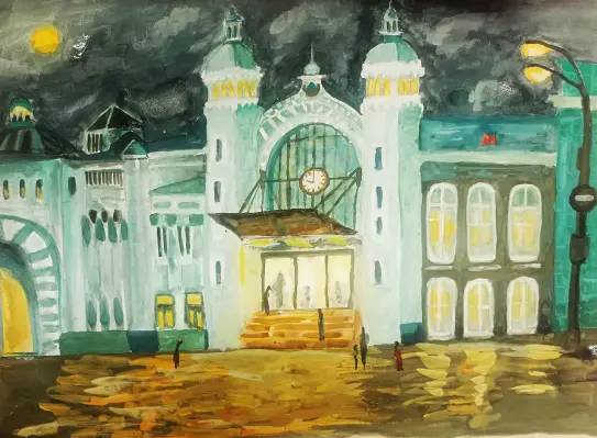 Гуашь, формат рисунка А3. Яркое, красивое историческое здание Белорусского вокзала впечатляет не только тех, кто приезжает в столицу нашей страны, но и жителей столицы