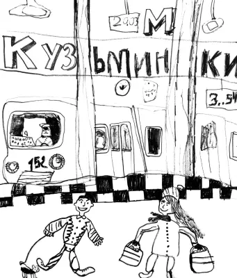 Прекрасная графическая работа выполнена в технике тушь, перо. Мы видим платформу на станции Кузьминки в подземном метро Москвы. Юному автору очень нравятся шумные поезда и подземные сооружения!