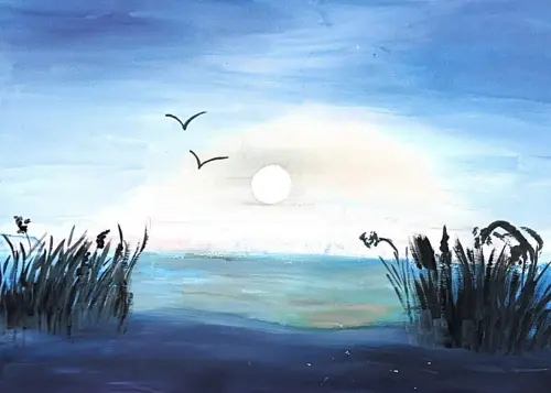 Мы часто гуляем с бабушкой на речке. И один раз решили взять кисточку с красками, бабушка взяла мольберт и мы начали рисовать. Бабушка подсказывала, как правильно наложить краски. И вот получилась красивая картинка.