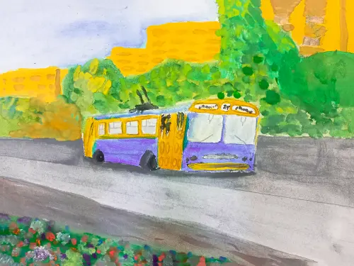 акварель Весной и летом улицы Москвы становятся очень красивые, а летом машин меньше и дороги свободные и еще красивее наши улицы, только автобусы едут, а раньше ездили по Москве еще и троллейбусы