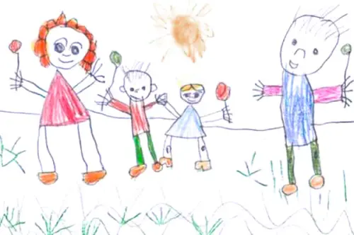 На рисунке — дружная семья! Папа высокий, мама чуть пониже, держат за руки двух детей. Девочка в голубом платье, мальчик в красной футболке. Все улыбаются, рядом нарисовано солнышко и яркий зелёный лужок.