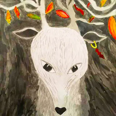 Прекрасный оленёнок с листиками на рожках на тёмном фоне. Ребёнок вдохновлялся мультиком. Рисунок выполнен акварелью на листе А4. Ребёнок очень старался!!!
