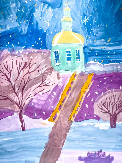Вид на храм Влахернской Божьей Матери со стороны парка. Мостик через обводной канал у пруда в усадьбе Кузьминки. Нежный зимний пейзаж на фоне заката. Формат А3. Гуашь.