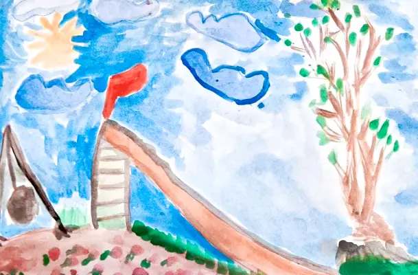 Около дома есть площадка. Мы на ней играем, веселимся, катаемся на горке, на качелях. Проводим очень много времени на площадке, и утром, и днем, и вечером.