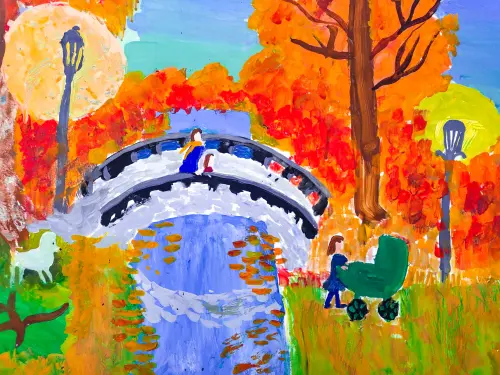 Хороши осенние прогулки в парке под светом фонарей. Нарядные деревья тихонько сбрасывают разноцветные листья. Вечер мягко опускается на город. Жёлтые фонари манят, как маленькие солнышки. Работа формата А2, гуашь.