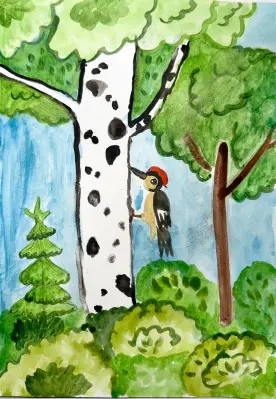 Лето - прекрасное время года. Вокруг много цветов, зелени. Рядом с нашим домом есть парк «Лосиный остров», в нём живёт много животных и птиц. Самая яркая птица - дятел. Это лесной доктор. Он избавляет деревья от вредителей. Все дупла и выемки, которые выдалбливает дятел, используют маленькие птички для гнёзд и ночлега.