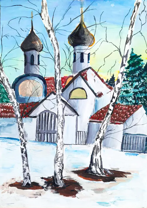 На своей работе я изобразил Храм Новомучеников Подольских, мимо которого я всегда прохожу по пути в свою художественную школу в поселке Шишкин Лес. Работа выполнена гуашью, формат А3.