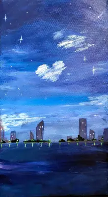 Тихим июньским вечером я гулял с друзьями вдоль Москвы-реки и увидел облако в форме сердца. Я сфотографировал сумеречное небо с редкими звёздами и подсвеченным прожектором облаком в форме сердца. А затем решил изобразить именно этот пейзаж акрилом на холсте. В моем районе всё прекрасно. Даже облака любят Филёвский Парк.