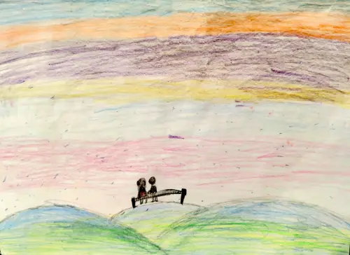 Работа 30х20, карандаш. Мы с братом очень любим мечтать. Однажды, сидя на скамеечке в парке, мы мечтали, как поедем летом к морю, увидим разноцветное небо и все будет так хорошо.