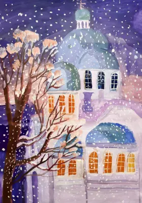Композиция на тему «Мой район». Перед нами прекрасная живописная работа в нежной розово-сиреневой гамме. Сюжетом для работы стал храм иконы Влахернской Божьей Матери. Работа формата А3, гуашь.