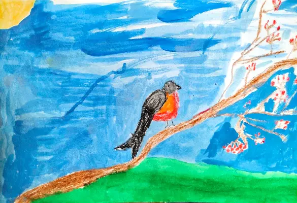 Работа 30х20, гуашь, карандаш. Сейчас лето, а я вспомнил красивую птицу, которую видел в парке зимой. Её называют снегирём. Мне она очень понравилась, и я решил, пусть она поживёт на картинке летом.