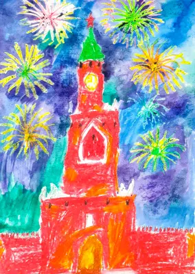 Работа выполнена под впечатлением от прогулки по праздничной Москве в День Победы. Ребёнок решил нарисовать Красную площадь - как сердце Москвы и праздничный салют, который был очень красивым в 2025 году.