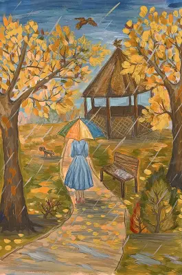 Однажды осенью я гуляла с собакой по парку. Был тёплый, осенний день, дождливый, но тихий. Я дошла до своей любимой беседки. Там было очень красиво в это время года, поэтому я решила запечатлеть этот день в парке. Это место я особенно люблю.