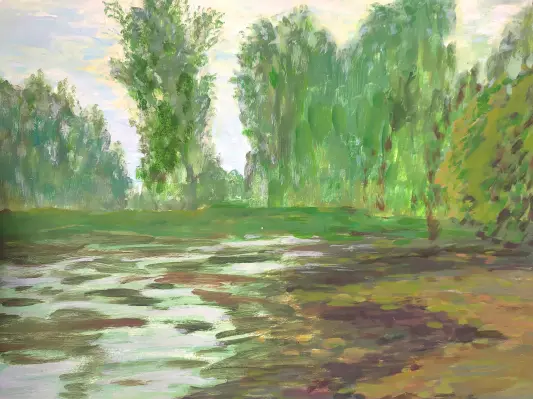 Пейзаж. Ученическая работа, летняя практика, пленэр. Живописная работа с изображением Верхнего пруда в усадьбе Влахернское-Кузьминки. Работа выполнена в технике «акрил», в формат А3.