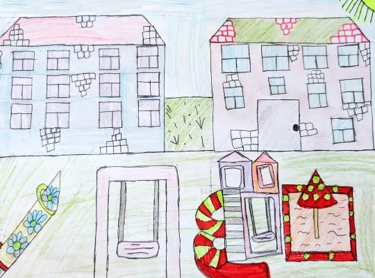 Я рисовала детскую площадку, на которой мы с братом любим гулять. На рисунке изображены качели, горки, песочница и дома, находящиеся рядом. Это наше любимое место. Место, куда мы бежим после уроков. Недавно на этой площадке мы познакомились с маленьким Ваней, ему всего 2 года. Из всех ребят на площадке он почему-то выбрал именно нас. Теперь мы часто играем с ним на этой площадке.