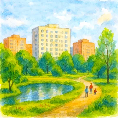 На рисунке изображён вид из Ботанического сада на район Марфино — здесь видно, как гармонично сочетаются город и природа. Современные дома органично вписываются в зелёный ландшафт: деревья, лужайки и аккуратные дорожки создают ощущение спокойствия и уюта. Такой вид подчёркивает, что даже в мегаполисе возможно сохранить природную красоту и сделать её частью городской жизни.