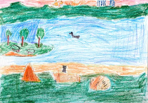 Этот детский рисунок изображает живописный пейзаж с природой и водой. В центре работы находится большой водоём или озеро, на котором плавает утка или лебедь, что символизирует спокойствие и гармонию природы. На берегу озера изображены деревья и кусты, что создает ощущение уединения и красоты природы.