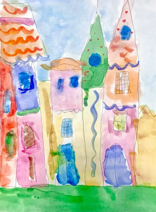 Рисунок ребенка, это его детская фантазия. В нашем большом районе много красивых домов. Все они воспринимаются ребенком как в волшебной сказке, что она показывает в своем рисунке.