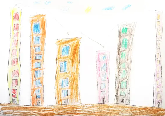 Мы живем в очень красивом районе. Из нашего окна в доме красивые виды. Много красивых домов, есть очень высокие, как на рисунке, но есть и пятиэтажные дома. В районе есть три парка.