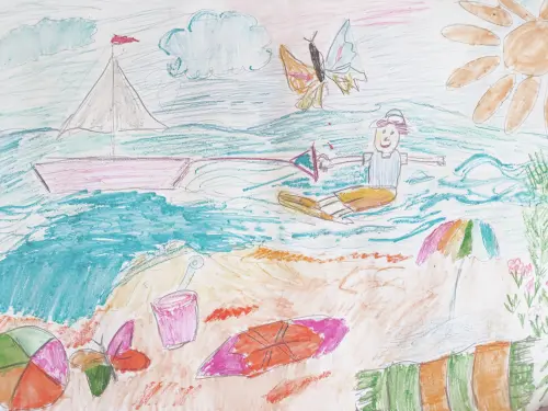 Маша очень любит проводить время на пляже. Она решила нарисовать пляж в своём районе Строгино. Наш район-полуостров, везде вода, много пляжей. Люди из других районов приезжают к нам летом на пляж.